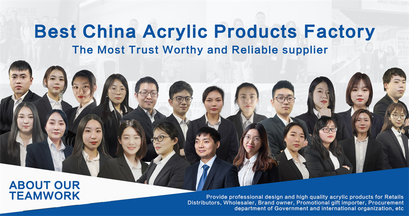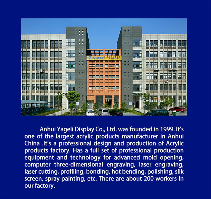 Anhui Yageli Display Co., Ltd., est situé dans la ville de Hefei, province d'Anhui, en Chine. Fondée en 1999, elle est l'un des plus grands fabricants dans la production professionnelle de produits d'affichage en acrylique et de plaques acryliques.